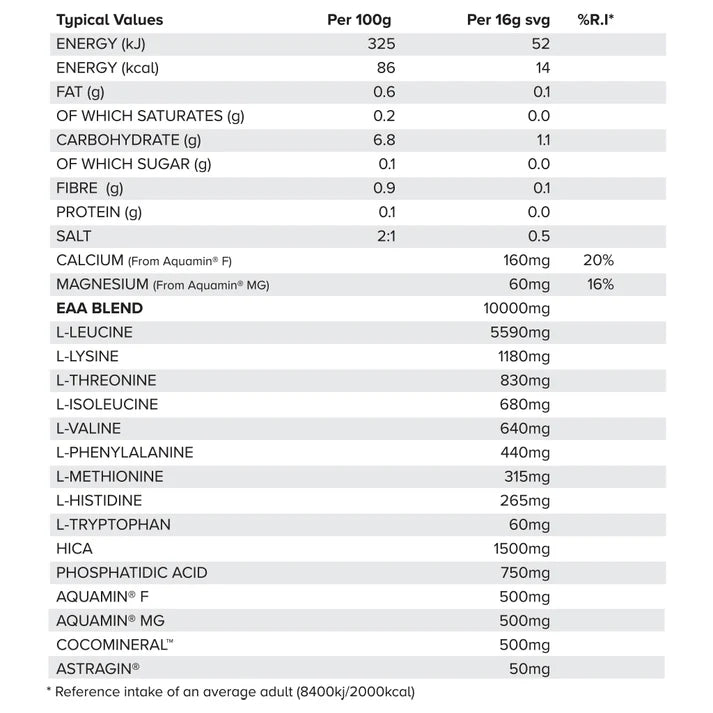 Utilising a Leucine enhanced blend of the 9 essential Amino Acids in addition to 750mg of Phosphatidic Acid & 1500mg of hydroxy-isocaproic acid (HICA) (Full Panel Below)